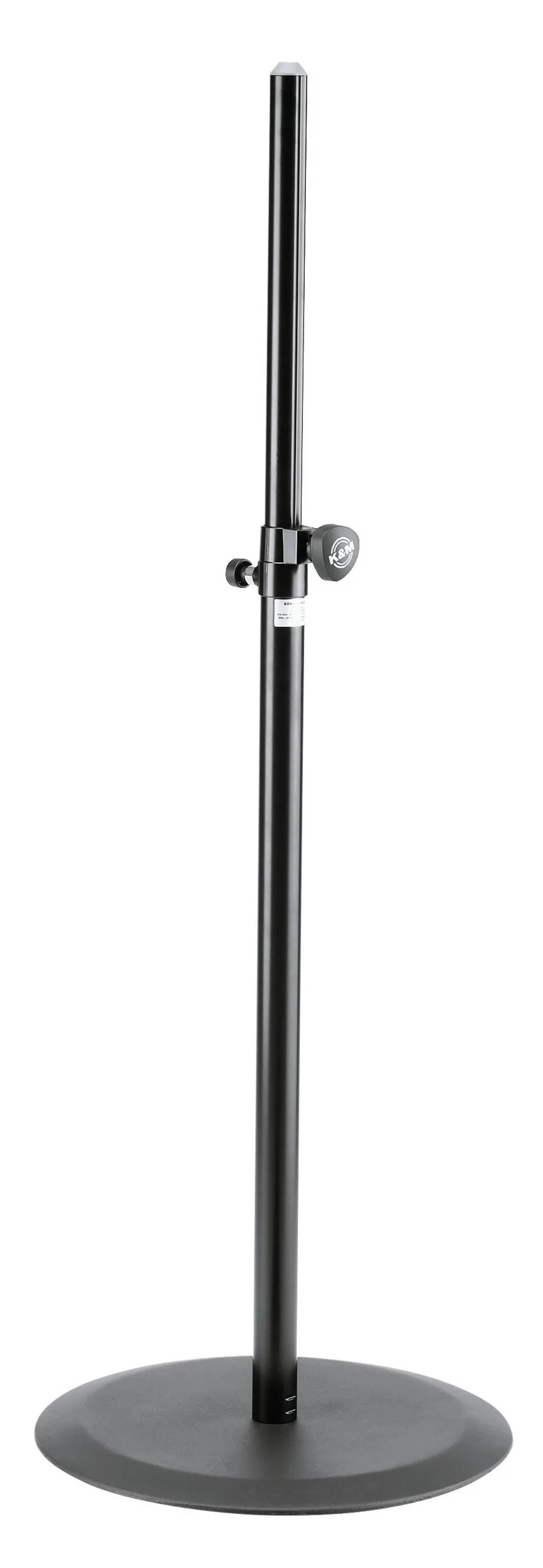 A decorative space saving speaker stand. The heavy cast iron plate with a relatively small diameter requires little space. The tried-and-tested spring-loaded bolt with locking screw makes height adjustment easy and safe.